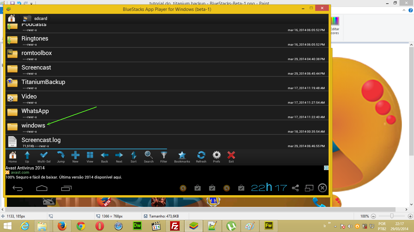 Geralmente essa pasta fica na raiz do micro SD esse pasta deve ser colada na pasta raiz do programa BlueStacks Beta-1. No programa tem uma pasta chamada Windows onde você tem acesso aos arquivos do computador.