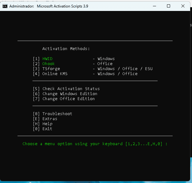 Nesse ponto é só escolher a opção 1, para fazer isso é só apertar o botão 1 do seu teclado, pronto, agora é só esperar o processo de ativação